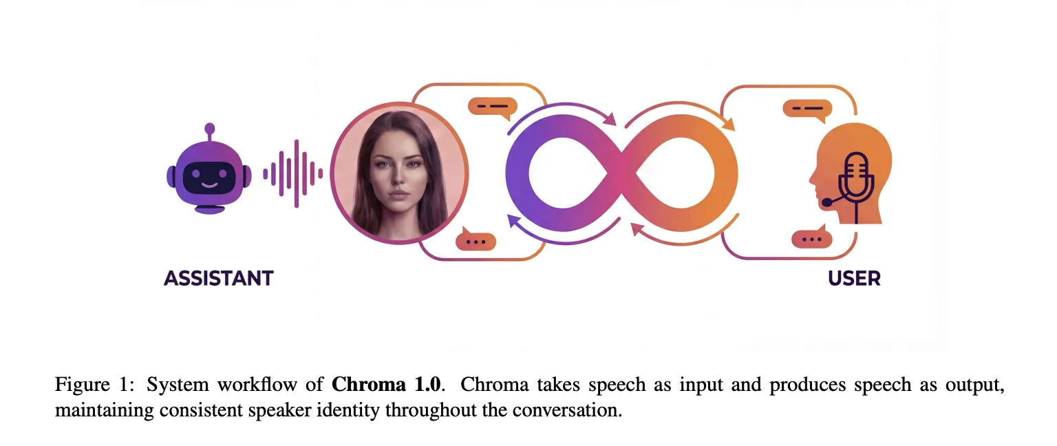 - End to end real time speech to speech: Chroma 1.0 is a 4B parameter spoken dialogue model that maps speech to speech directly using codec tokens, it avoids explicit ASR and TTS stages and preserves prosody and speaker identity through the whole pipeline.