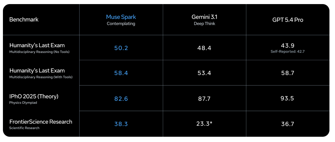 In Contemplating mode, Muse Spark scores 58.4 on Humanity’s Last Exam With Tools — a benchmark designed to test expert-level multidisciplinary knowledge — compared to Gemini 3.1 Deep Think’s 53.4 and GPT-5.4 Pro’s 58.7. On FrontierScience Research, Muse Spark Contemplating reaches 38.3, ahead of GPT-5.4 Pro’s 36.7 and Gemini 3.1 Deep Think’s 23.3.