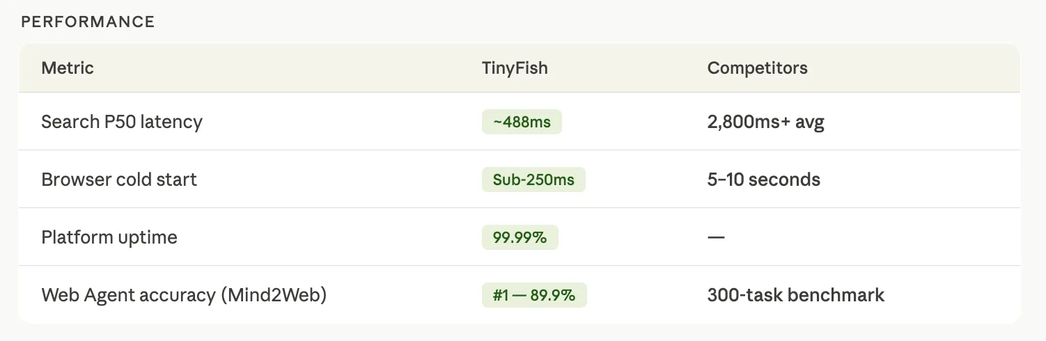 - TinyFish moves from a single web agent to a four-product platform — Web Agent, Web Search, Web Browser, and Web Fetch — all accessible under one API key and one credit system, eliminating the need to manage multiple providers.